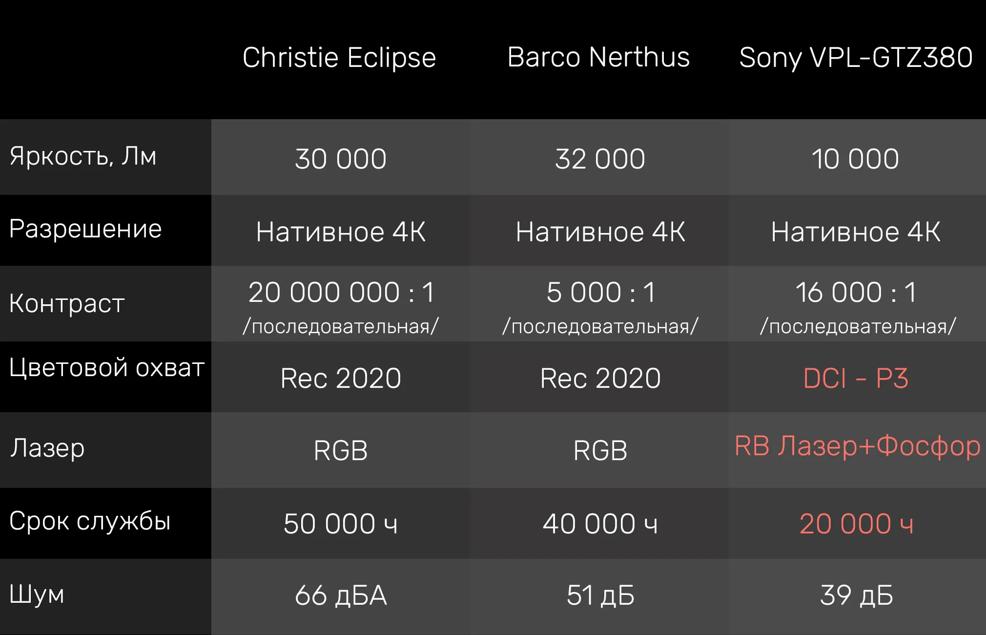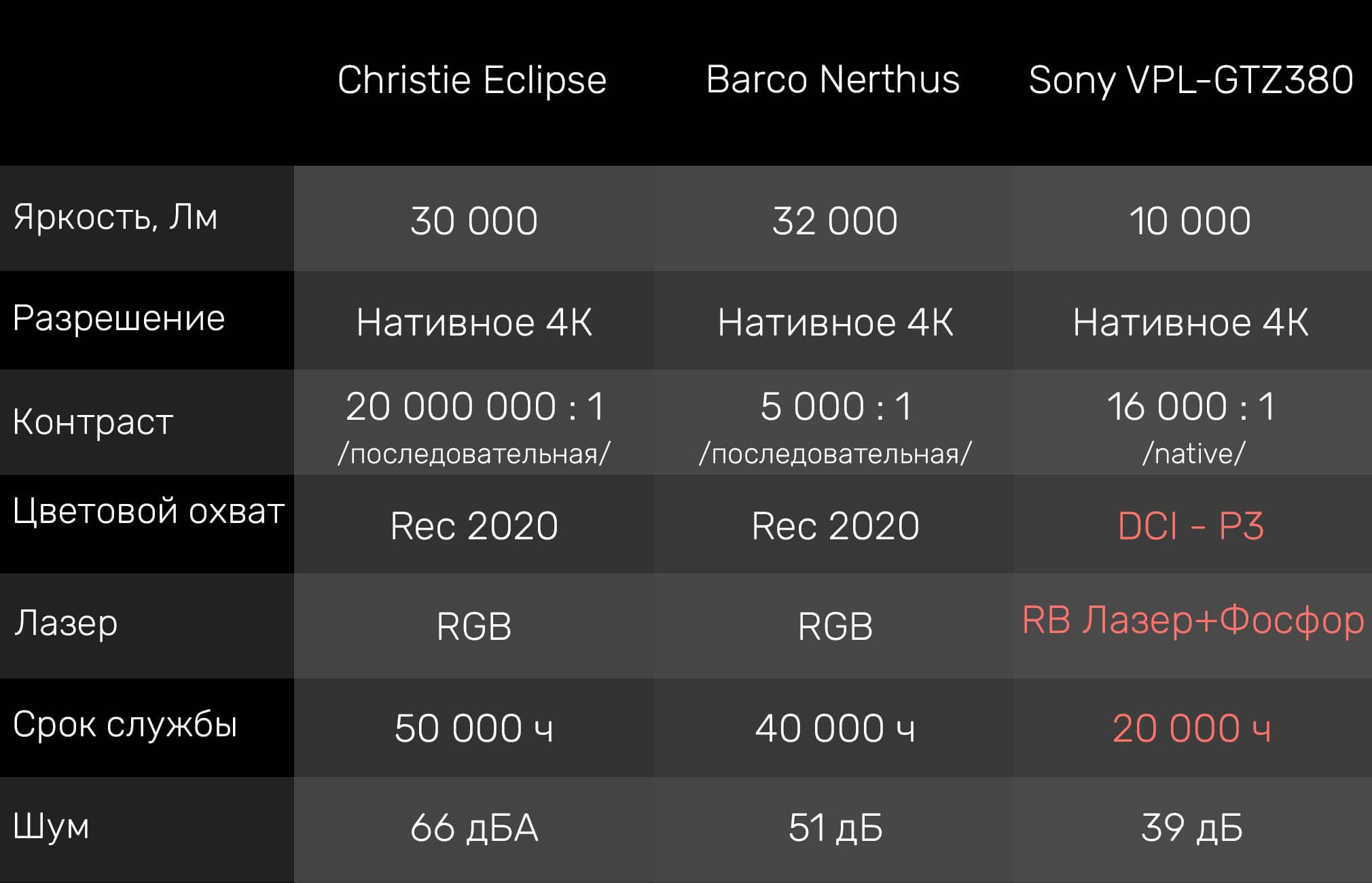 По совокупности характеристик их всего один на сегодня: Barco Nerthus. Мы добавим для презентативности проектор Sony VPL-GTZ380 с яркостью в 3 раза меньше.