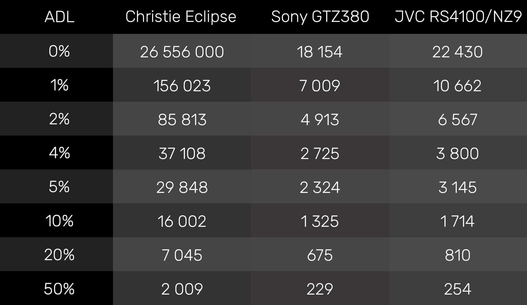 Методики измерения контрастности картинки в персональных кинозалах (ADL и остальные) мы рассмотрим в отдельной статье. Сейчас для понимания “конвертируем” ADL в понятную методику контрастности два значения: