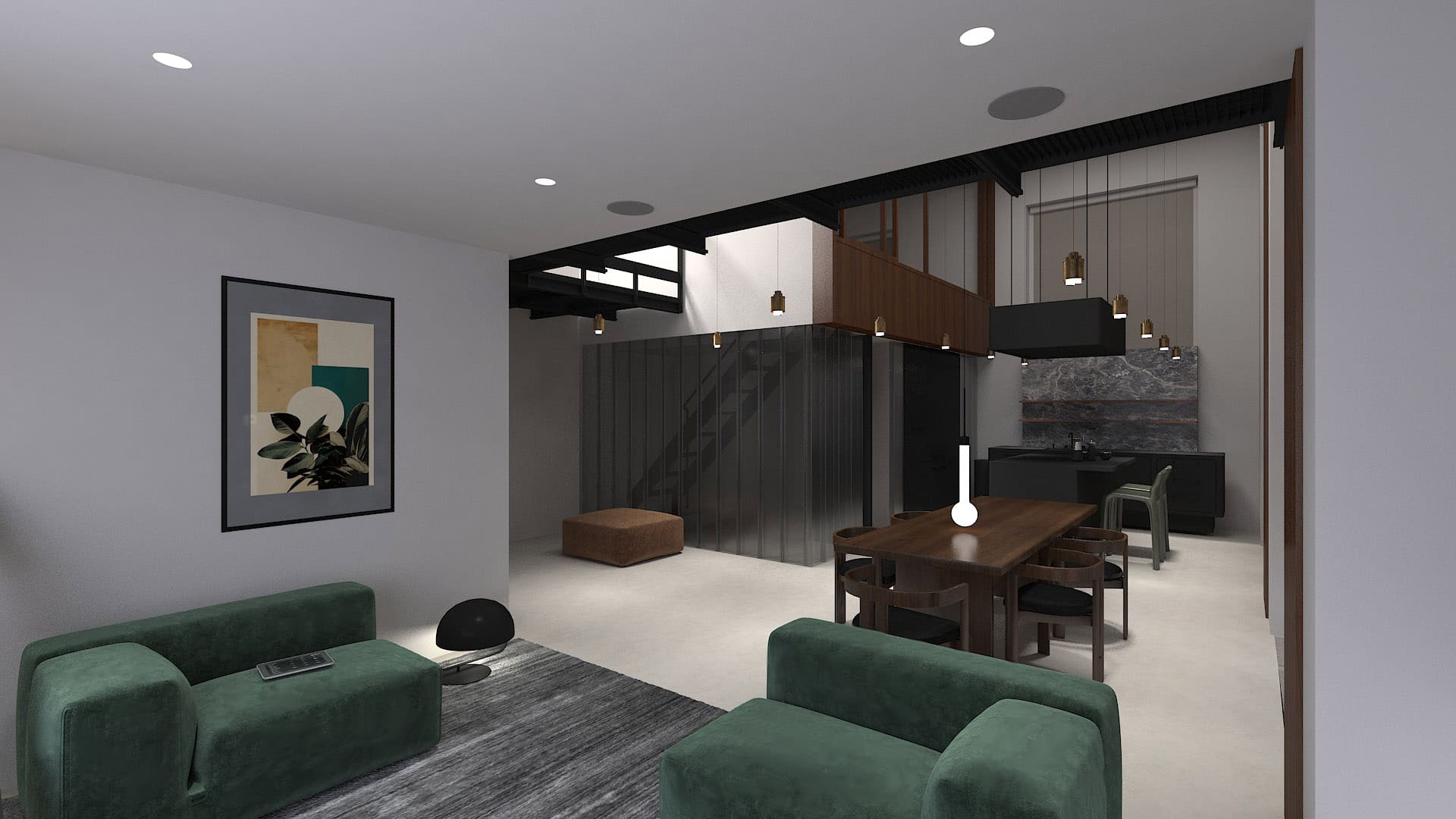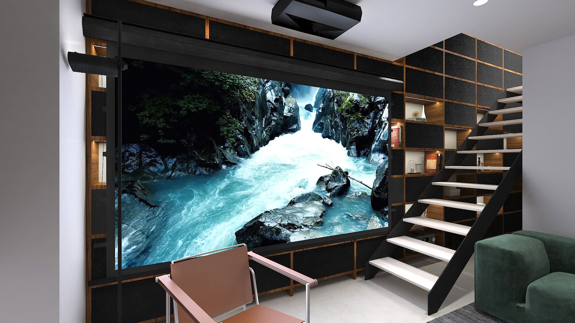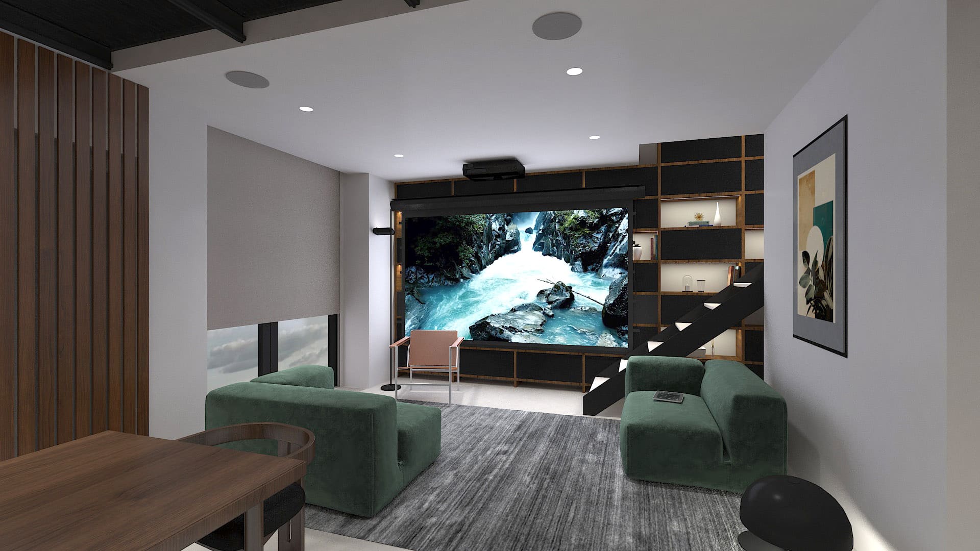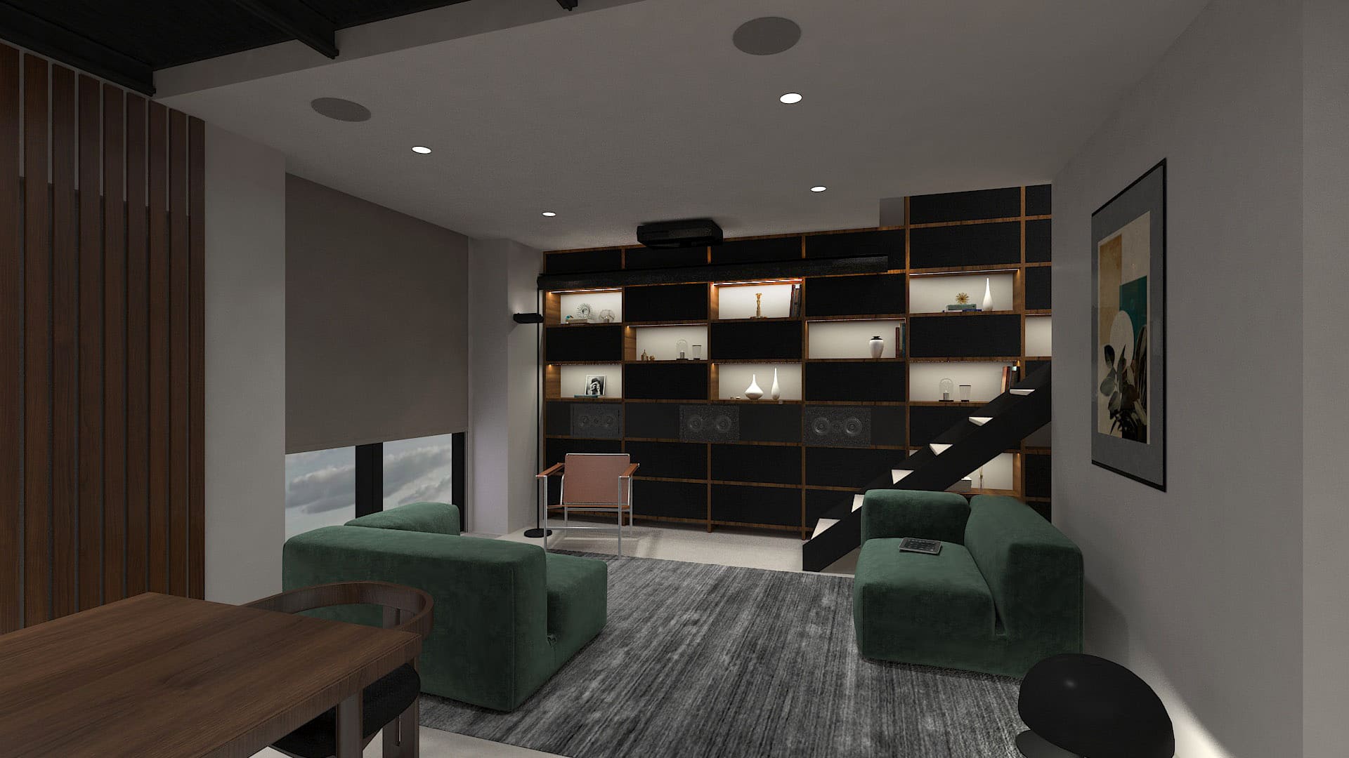Идея домашнего кинотеатра в гостиной возникла на раннем этапе проектирования, поэтому нам удалось элегантно вписать всё оборудование в компактное пространство. Исходная константа – поверхность фронтальной стены будет закрыта стеллажами.