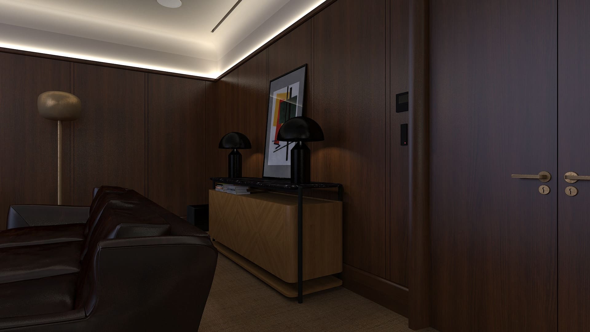 Объект – офис крупной компании в центре Москвы. Все общие пространства выполнены на стыке современности и минимализма, однако зона отдыха с баром и кинотеатром для руководства, соседствующая с переговорной, выполнена в стиле, сочетающем классическую элегантность и современную брутальность с акцентом на статус. Попадая в это пространство, кажется, что находишься в лондонском интерьере вроде ателье из фильма Кингсмэн. Полный восторг!