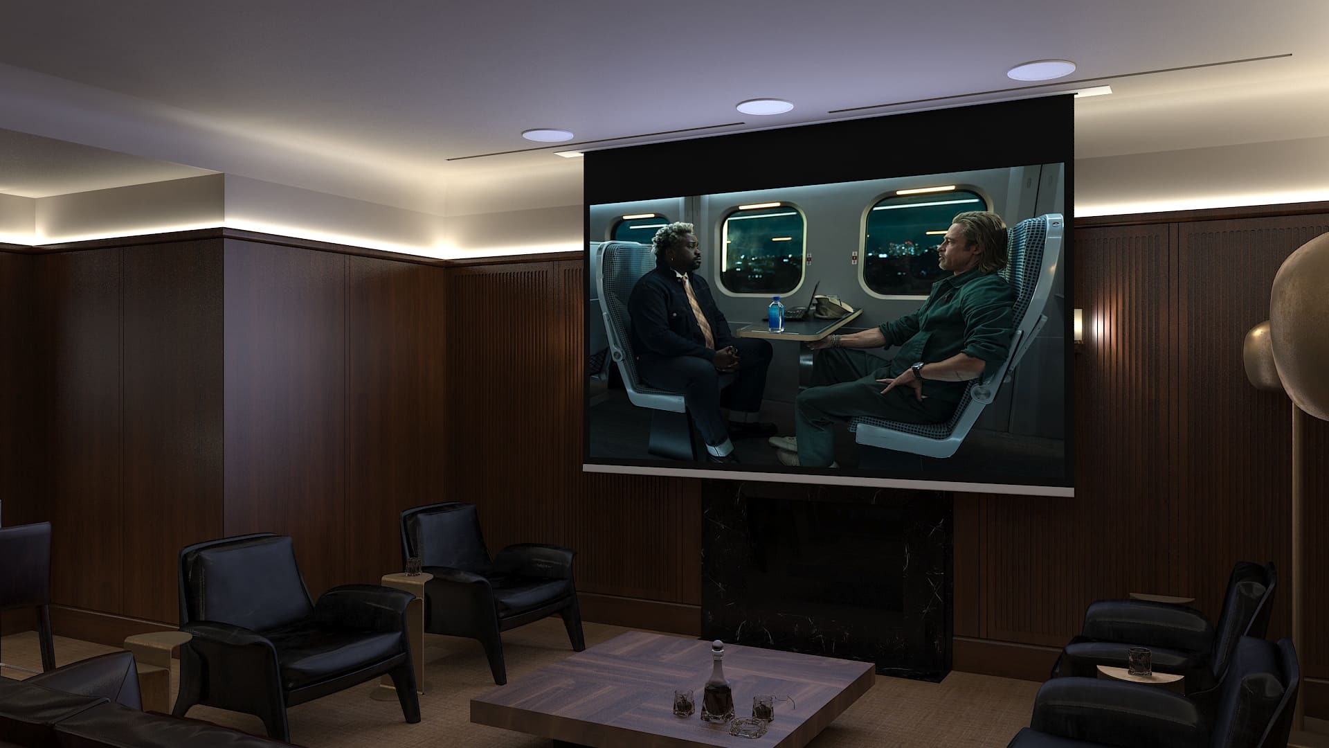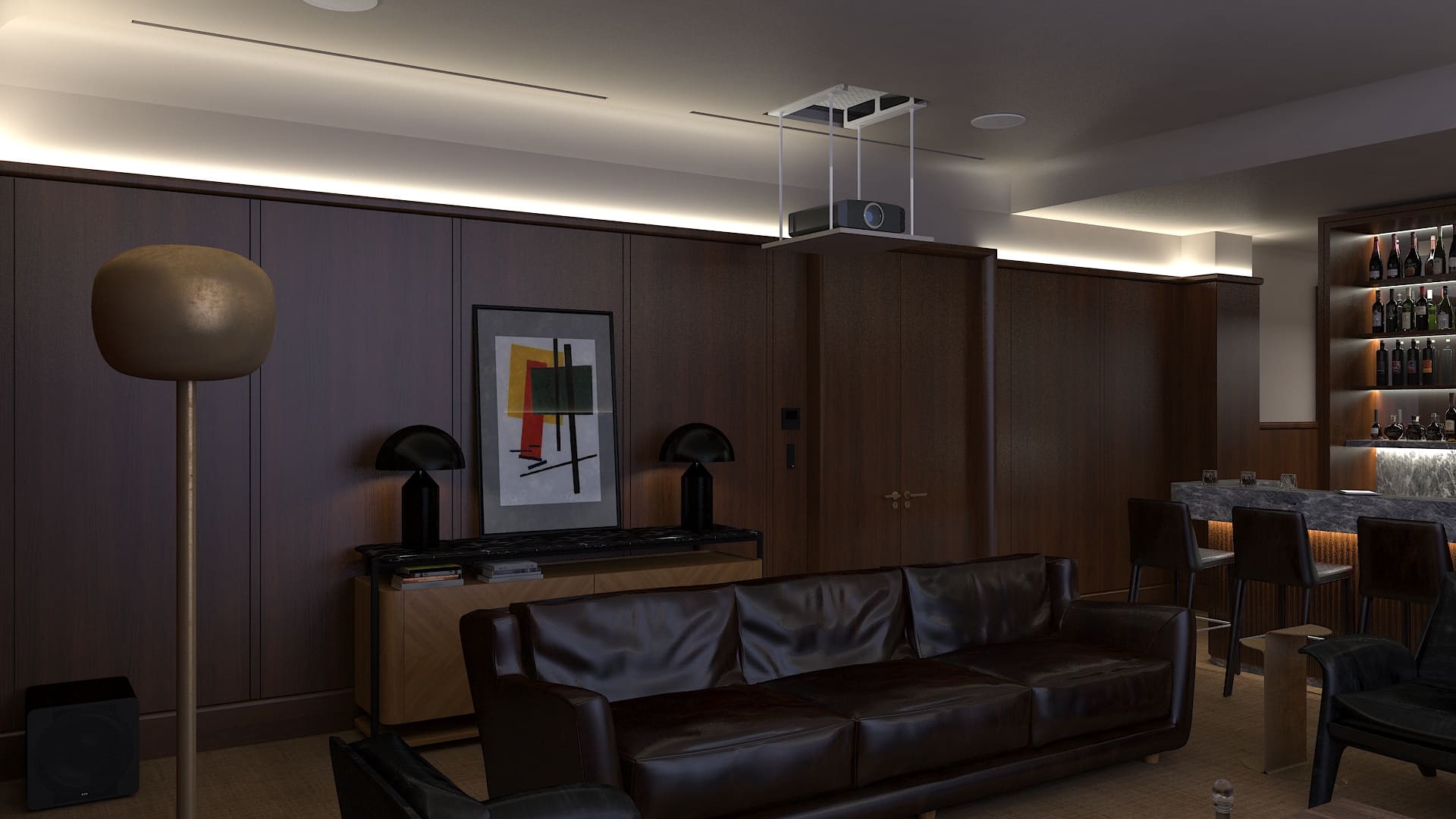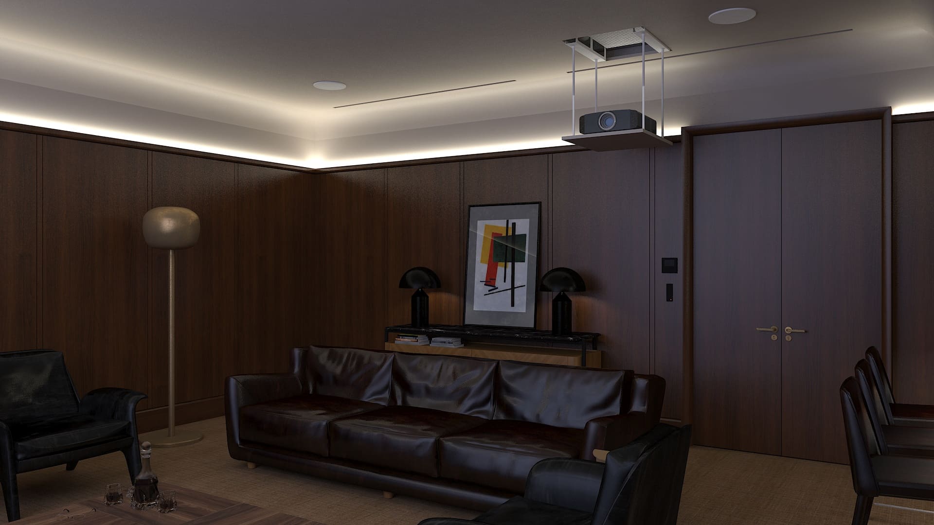 Визуальное присутствие проектора тоже попросили минимизировать, хотя бы, когда кинотеатр не используется. В результате, после долгих согласований удалось выделить место в запотолочном пространстве и дополнительный бюджет на моторизованный лифт для проектора.