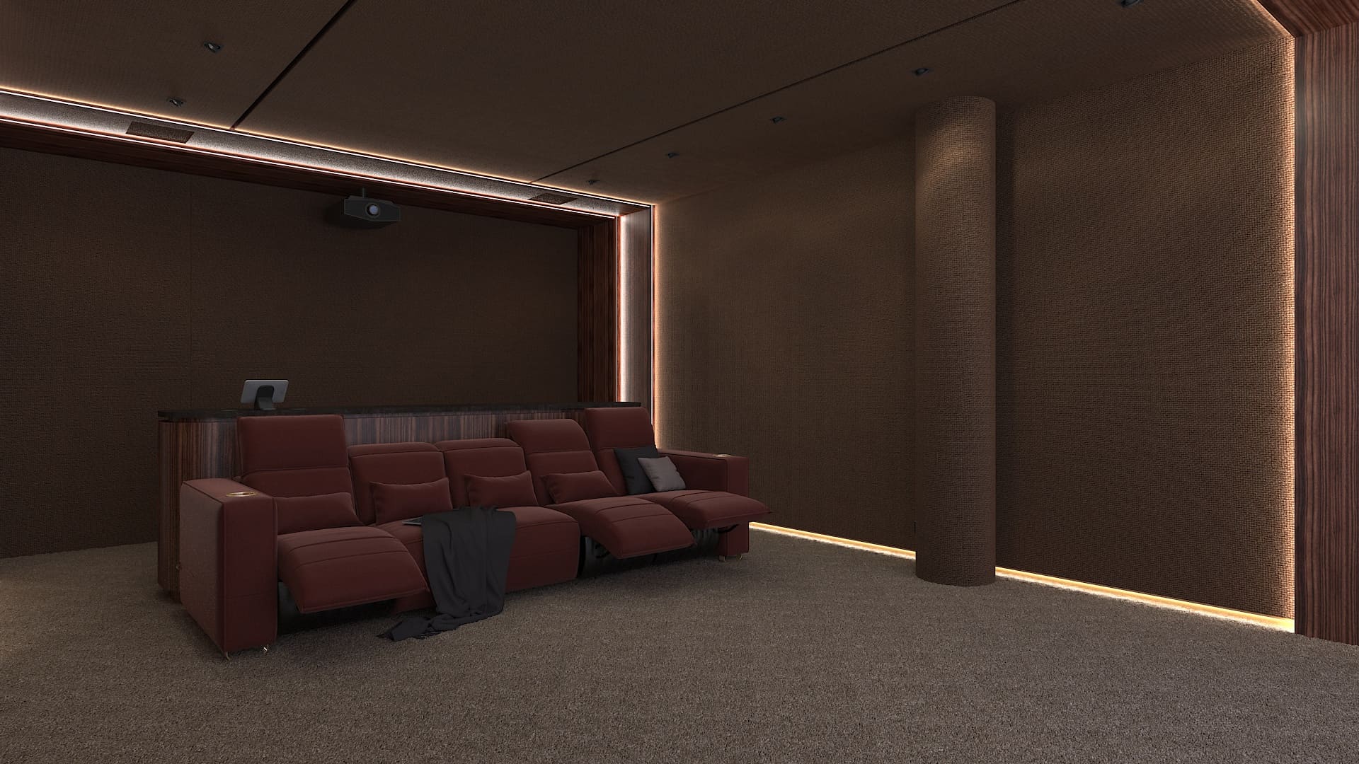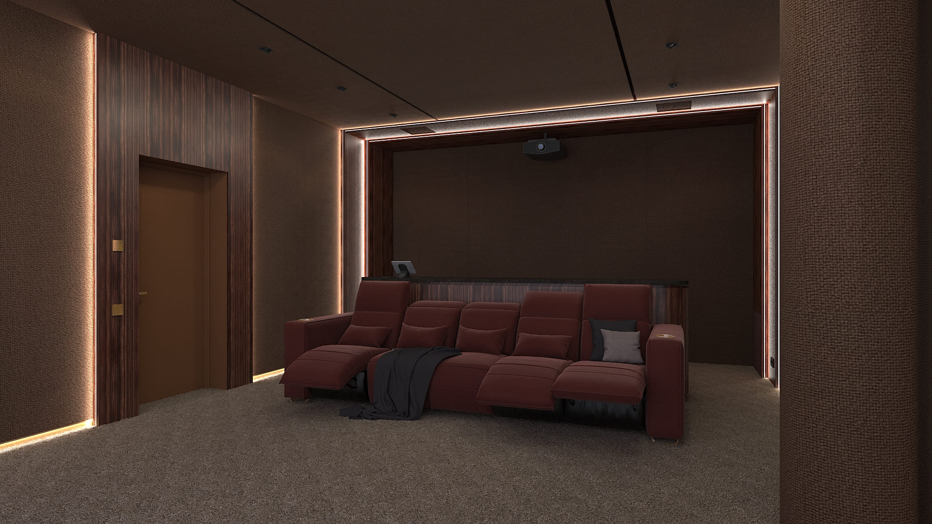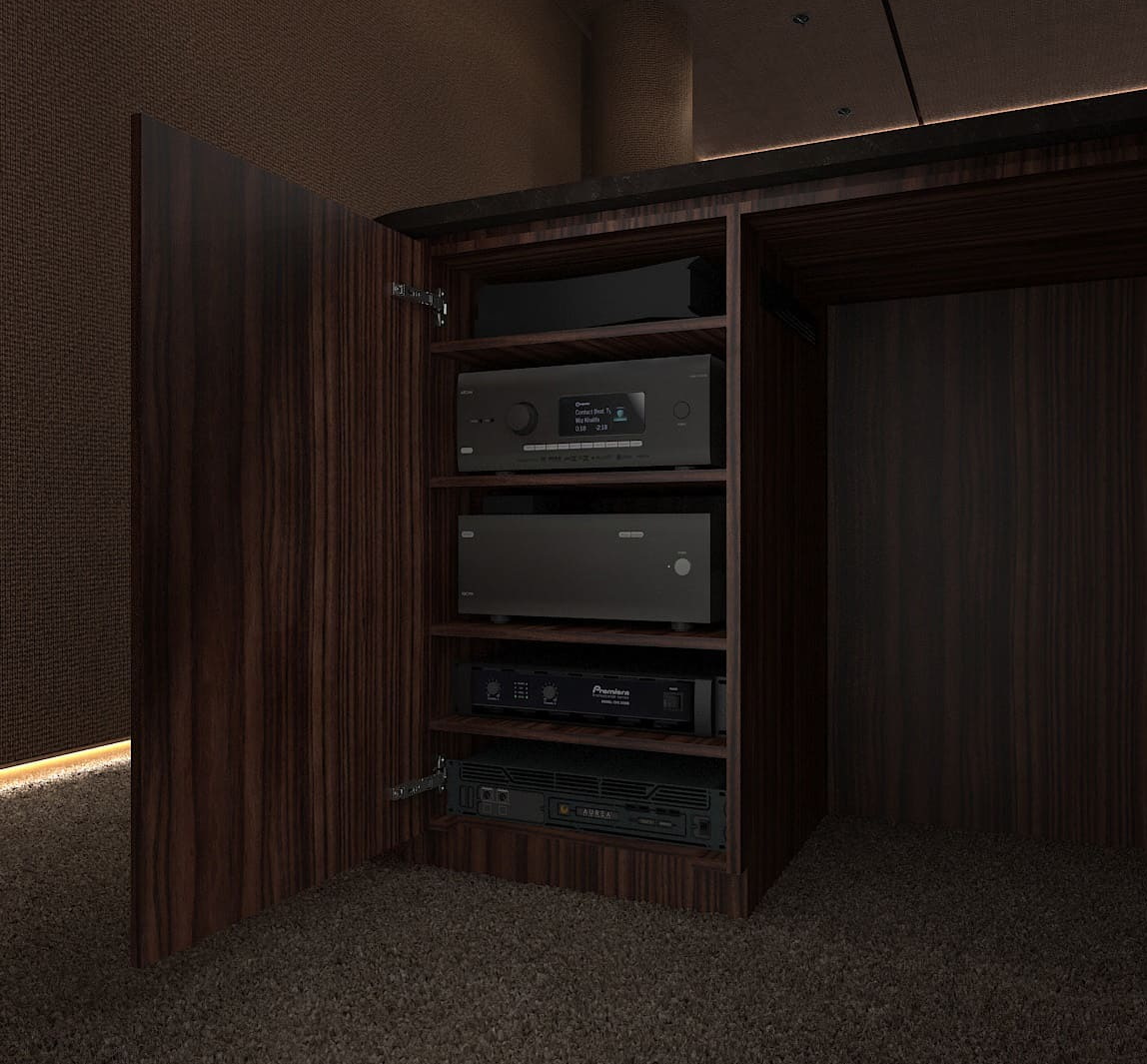 Концепция современного респектабельного интерьера кинозала разработана дизайн-студией, которая занималась дизайном всего дома. Мы адаптировали её с учётом нужного расположения колонок и сабвуферов и создания нужной акустической среды. Поэтому на стенах вместо искусственной замши появилась акустическая ткань, за которой находятся акустические системы, а щиты порталов с редким шпоном эбен макассар были заменены на перфорированные акустические панели с тем же шпоном.