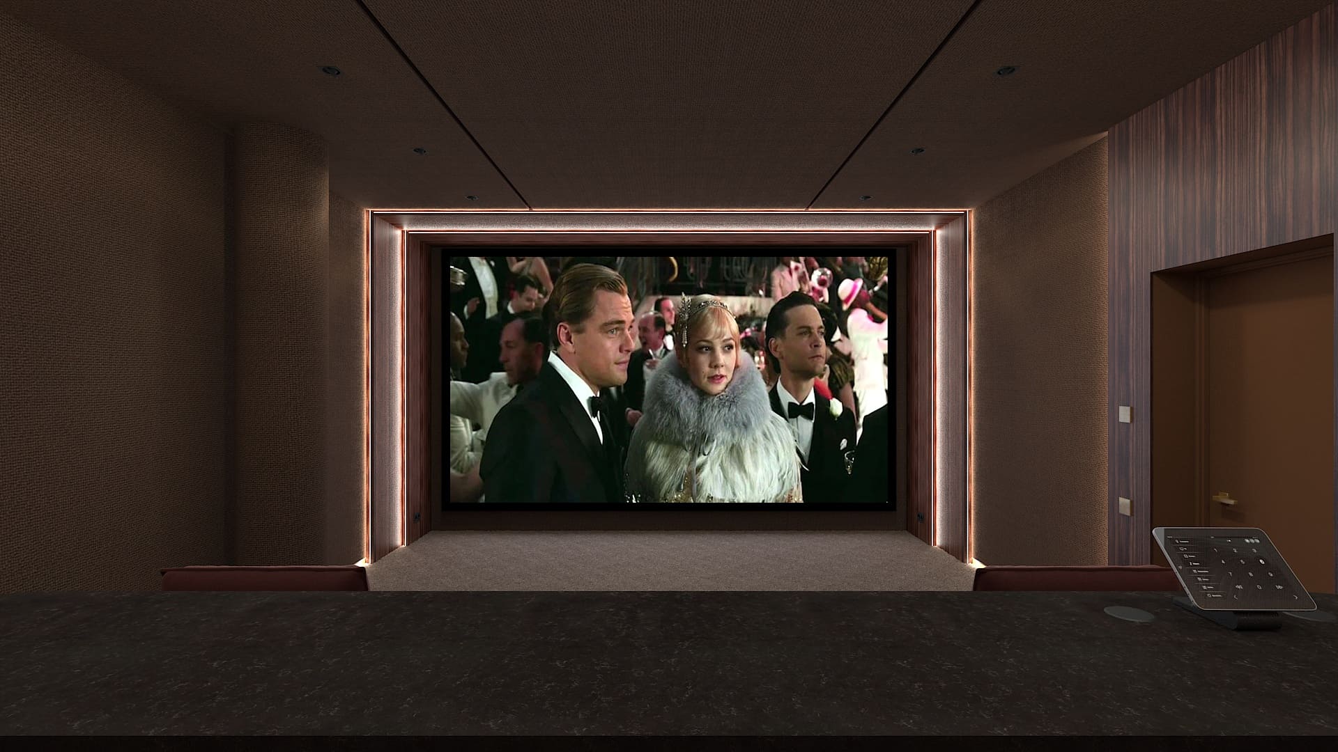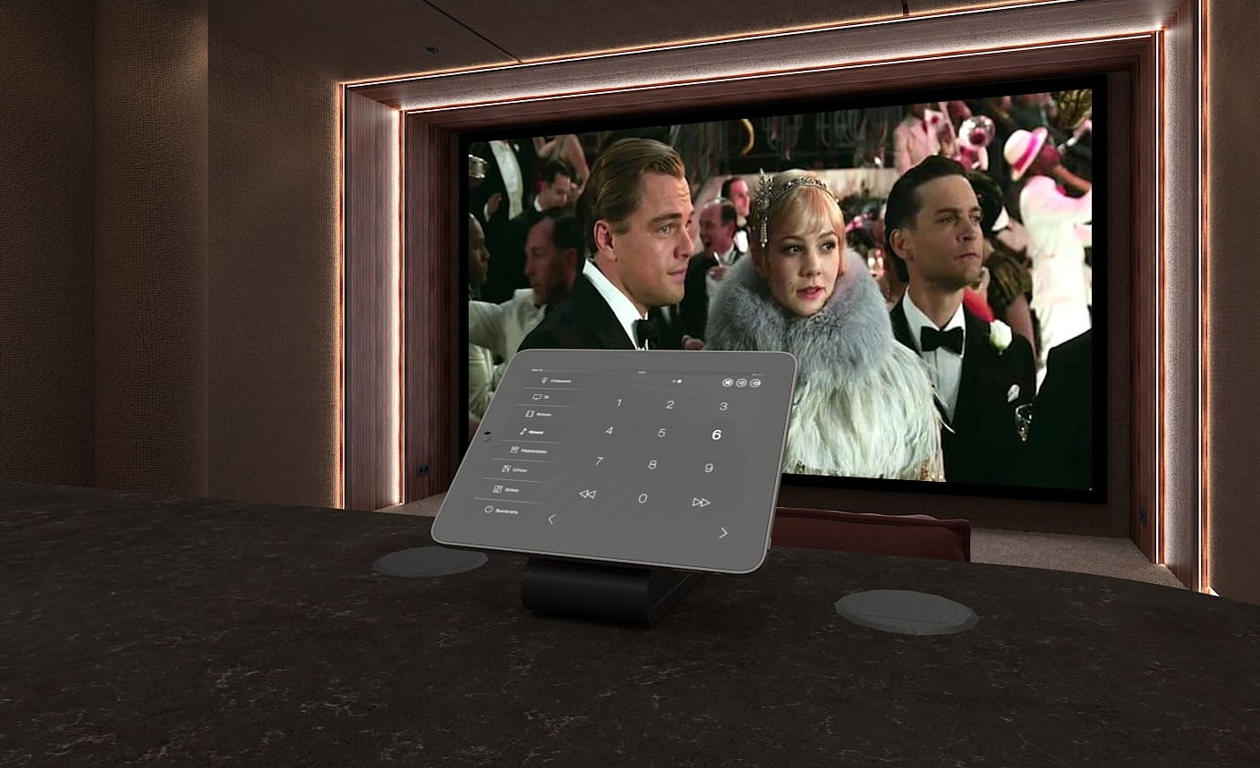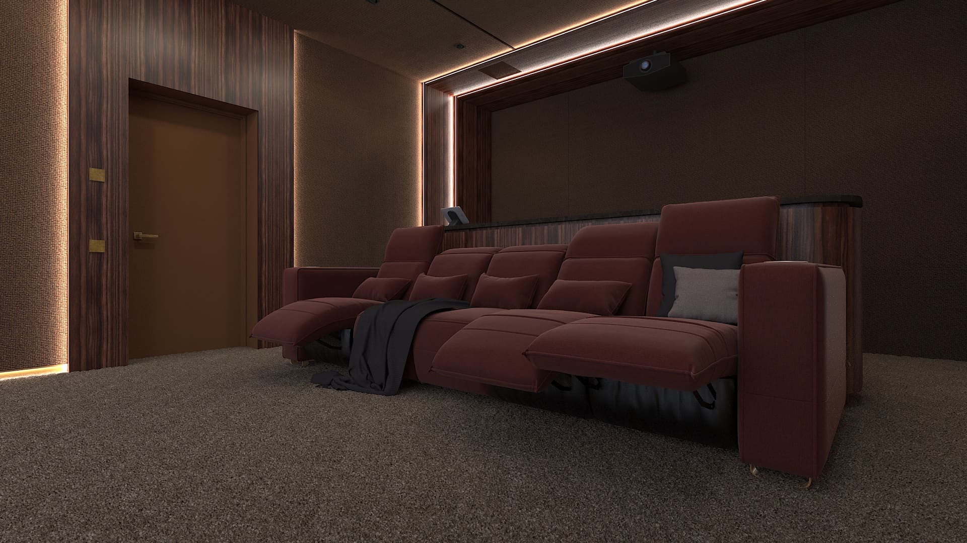Концепция современного респектабельного интерьера кинозала разработана дизайн-студией, которая занималась дизайном всего дома. Мы адаптировали её с учётом нужного расположения колонок и сабвуферов и создания нужной акустической среды. Поэтому на стенах вместо искусственной замши появилась акустическая ткань, за которой находятся акустические системы, а щиты порталов с редким шпоном эбен макассар были заменены на перфорированные акустические панели с тем же шпоном.