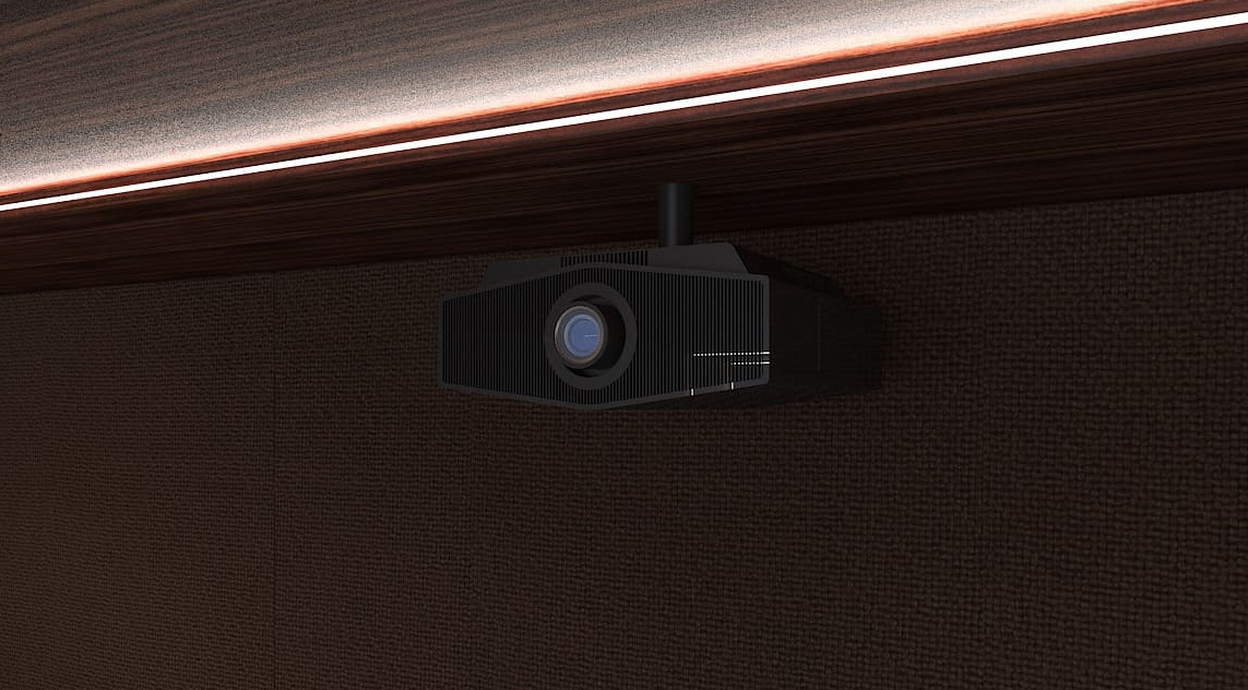 За картинку отвечают лазерный проектор Sony, и акустически проницаемый экран во всю ширину стены. Яркости проектора немного не хватает до нормативов HDR, но с избытком достаточно для обычного контента.