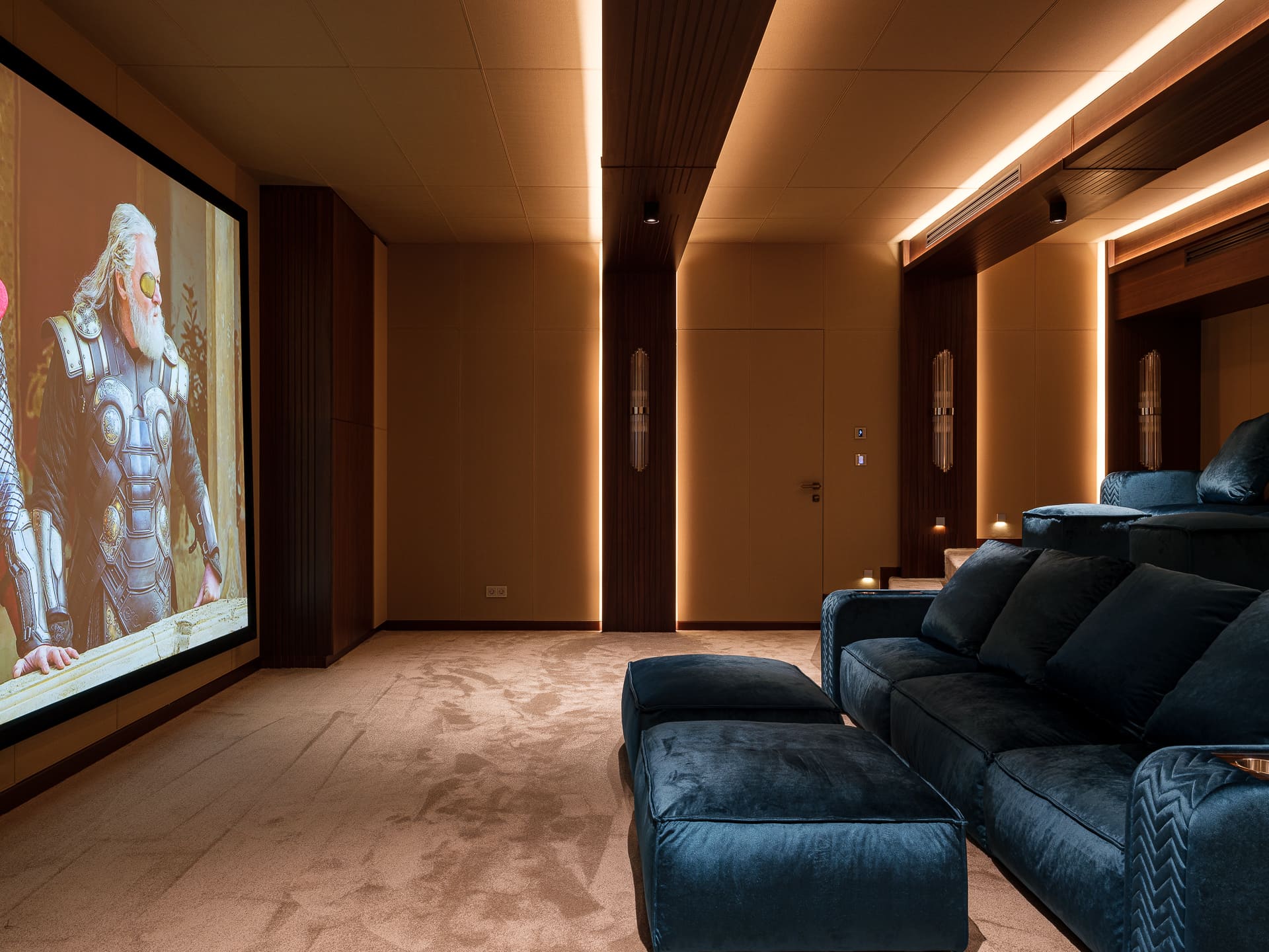 Стены кинозала отделаны звукопрозрачной тканью в сочетании декоративными элементами из дерева.